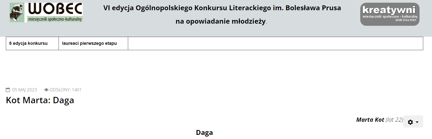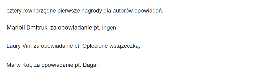 Opowiadanie „Daga” zostało nagrodzone pierwszym miejscem w VI Ogólnopolskim Konkursie Literackim im. Bolesława Prusa.